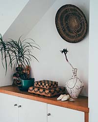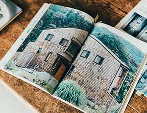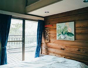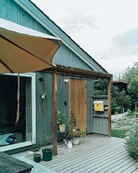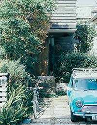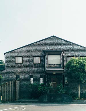 こちらも傾斜地に建つD邸。正面の道路から見ると平屋に見えるのが特徴です。リビングには勾配天井や借景を活かす低い位置に設けられた窓、屋根裏の壁に開けられた四角窓など様々な工夫があります。オーナー様の使いやすさを顧慮したキッチンや明るく抜け感のある寝室も魅力です。現時点で築10年、シングルサイディングの外壁が非常に趣ある経年変化を見せています。