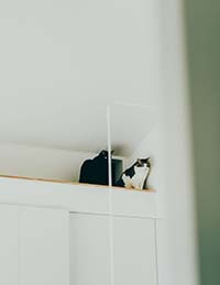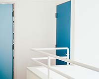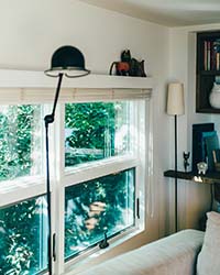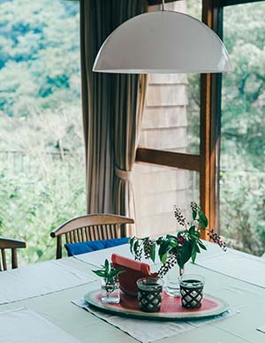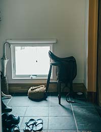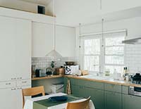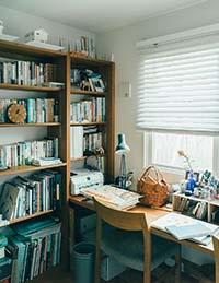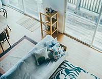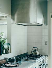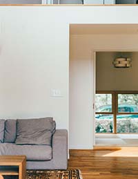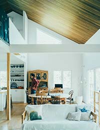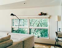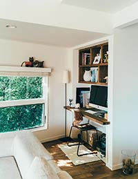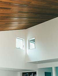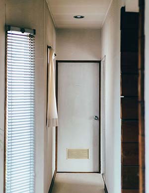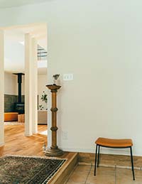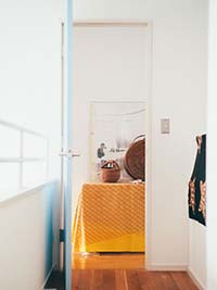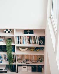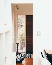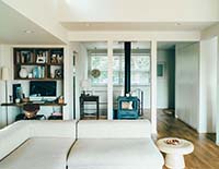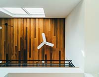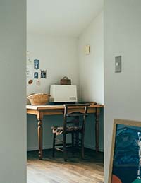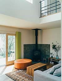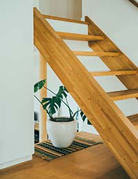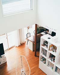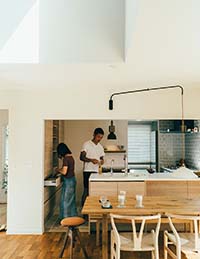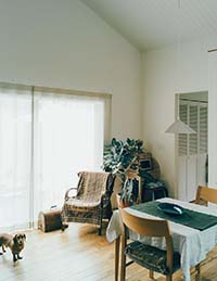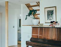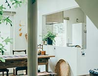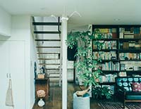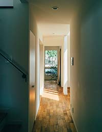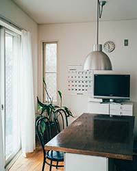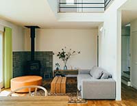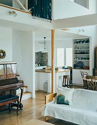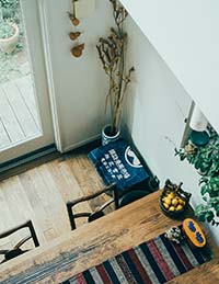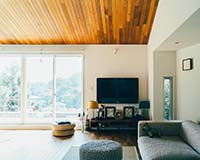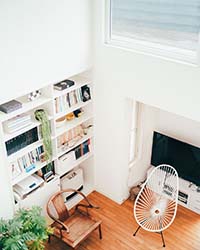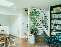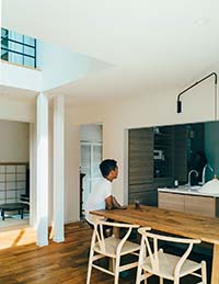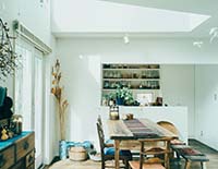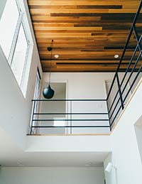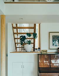 現在セカンドオーナー様がお住まいのB邸は、ややコンパクトな作りのリビングでありながら、採光を綿密に計算した吹き抜け構造と2Fの高さに設けられた大きなFIX窓が家全体に時間や季節の移ろいを教えてくれます。リビングから玄関への抜けの良さと2階に設けられた3部屋を結ぶ廊下は、住まいの回遊性を高めています。お住み継ぎに際する工事も技拓が行いました。