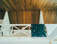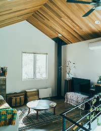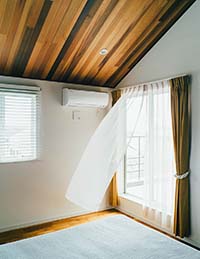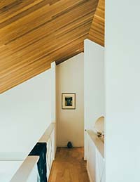 大きな木々に囲まれるように傾斜地に建つC邸は、必要最小限の扉と壁や構造体で空間を緩やかに区分けする、技拓らしさ溢れる住まいです。玄関とリビングは階段越しに双方を覗くことができ、視界に飛び込む2階の廊下は、家族の声や往来を感じさせ、家と家族の一体感を生み出します。レッドシダーパネリングの魅力を最大限に発揮する大断面の勾配天井も技拓の設計の強みです。
