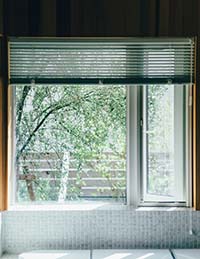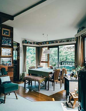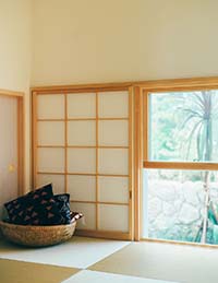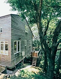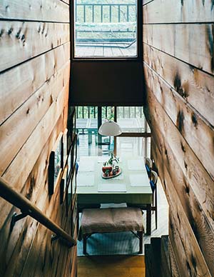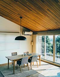 1975年に竣工した技拓の第1号邸です。シングルサイディングの印象的な外観と室内に設けられた借景を生かす窓が魅力。階段や寝室など様々な場所から緑を眺めることができ、立地を最大限に生かした作りが技拓らしくもあります。内壁にもレッドシダーを用い、細部のあしらいも当時らしいものとなっており、「時を経て趣を増す家づくり」を今でも体現する家です。