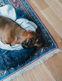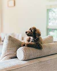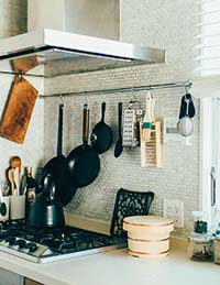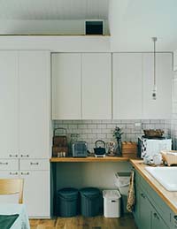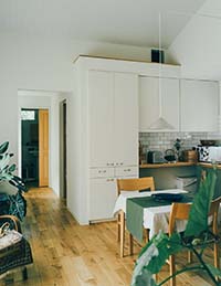 ちびスケシリーズをベースに建てられた平屋です。大人2人に猫と犬という家族構成を念頭に置き、勾配天井で広さを感じさせるダイニングキッチンを中心に構成されています。本来は寝室に当たる部分を書斎とし、増築設計した部分に寝室やWICなどプライベートスペースをまとめています。生活家電等は収納するスペースを設けることで、コンパクトでもゆとりを感じさせる空間に作りあげています。